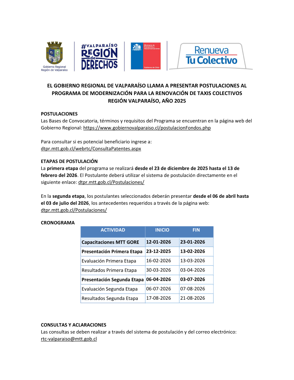 2025-12-24 – Gobierno Regional de Valparaíso llama a presentar postulaciones al programa de modernización para la renovación de taxis colectivos, región Valparaíso, año 2025