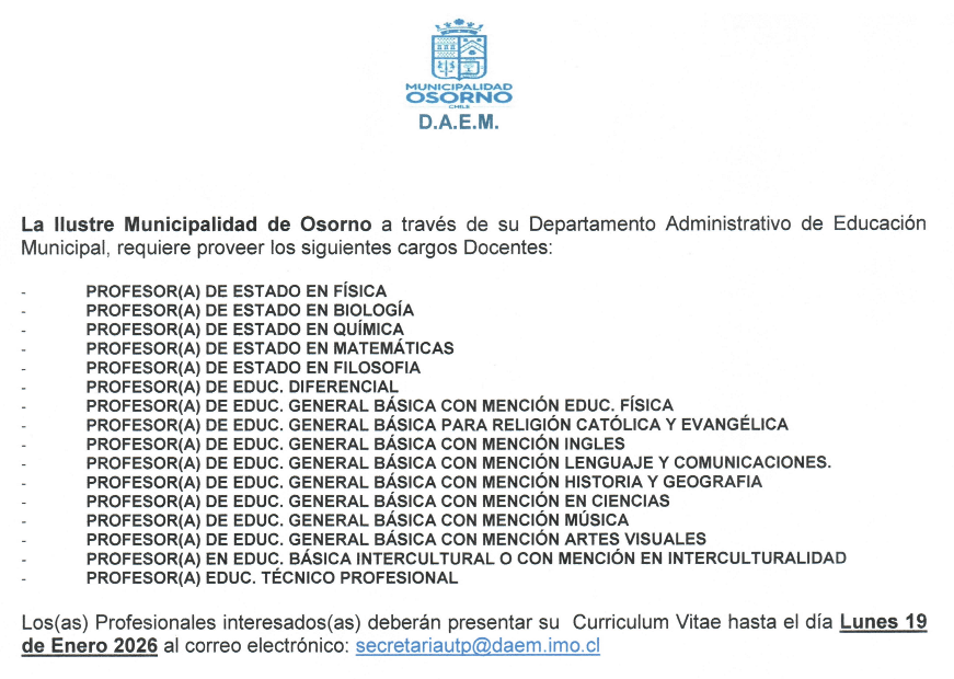 2026-01-13 – Ilustre Municipalidad de Osorno requiere proveer cargos docentes