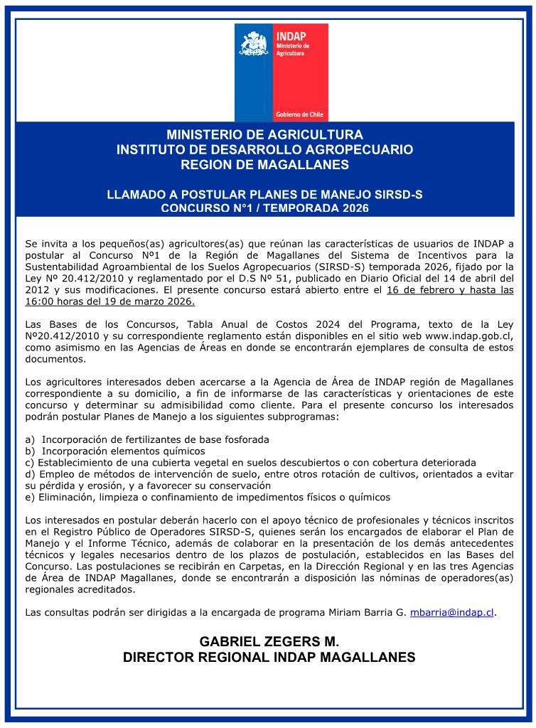 2026-02-06 – INDAP Magallanes publica llamado a postular al Concurso N°1 del Sistema de Incentivos para la Sustentabilidad Agroambiental de los Suelos Agropecuarios (SIRSD-S), temporada 2026