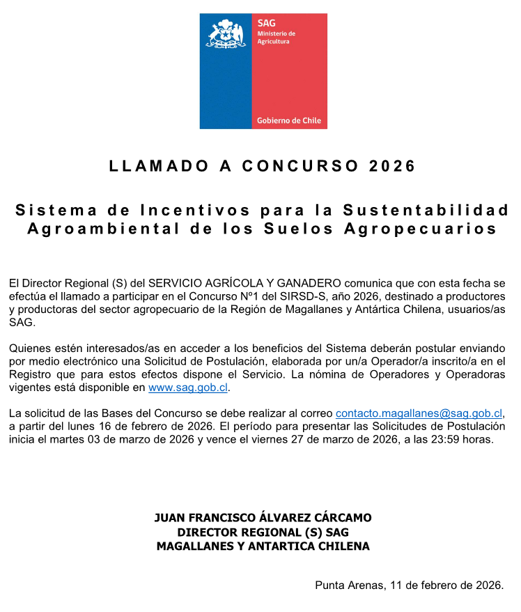 2026-02-11 – Servicio Agrícola y Ganadero de la Región de Magallanes y Antártica Chilena llama a participar en el Concurso Nº1 del SIRSD-S, año 2026