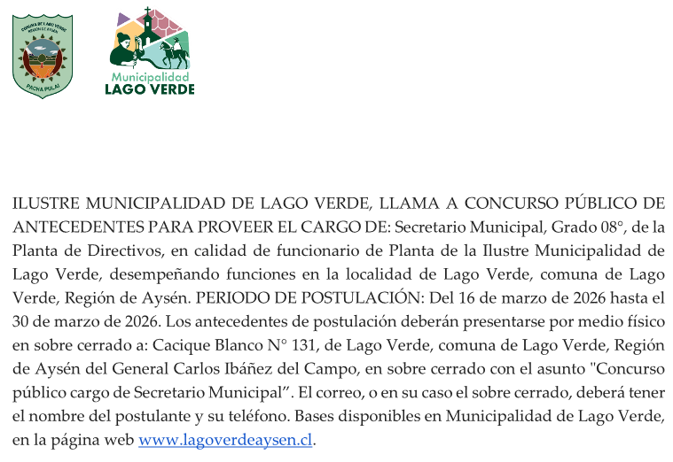 2026-03-16 – Ilustre Municipalidad de Lago Verde llama a Concurso Público de Antecedentes para proveer el cargo de Secretario Municipal