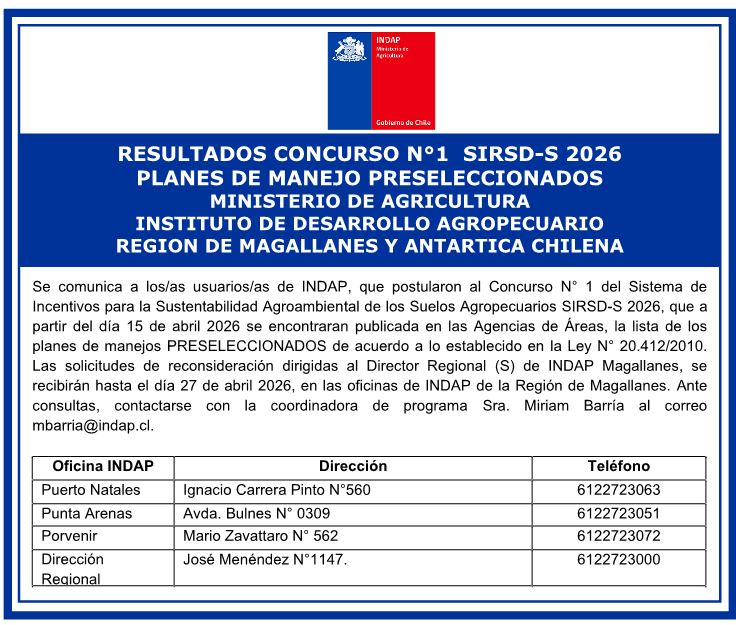 2026-04-14 – INDAP Magallanes publica resultados del Concurso N°1 del Sistema de Incentivos para la Sustentabilidad Agroambiental de los Suelos Agropecuarios (SIRSD-S), temporada 2026